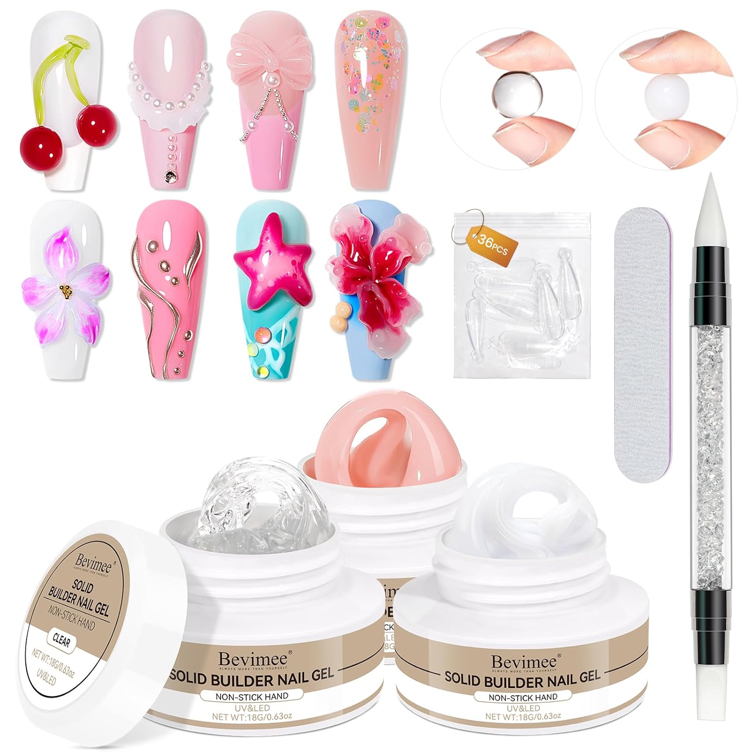 Solid Builder Gel for Nails 3PCS, 3D Hard Gel for Nail Art Sculpting Non-Stick Hand, Clear White Nude for Modeling, Sculpture, Nail Extension UV/Led Manicure DIY At Home 18g*3Colors