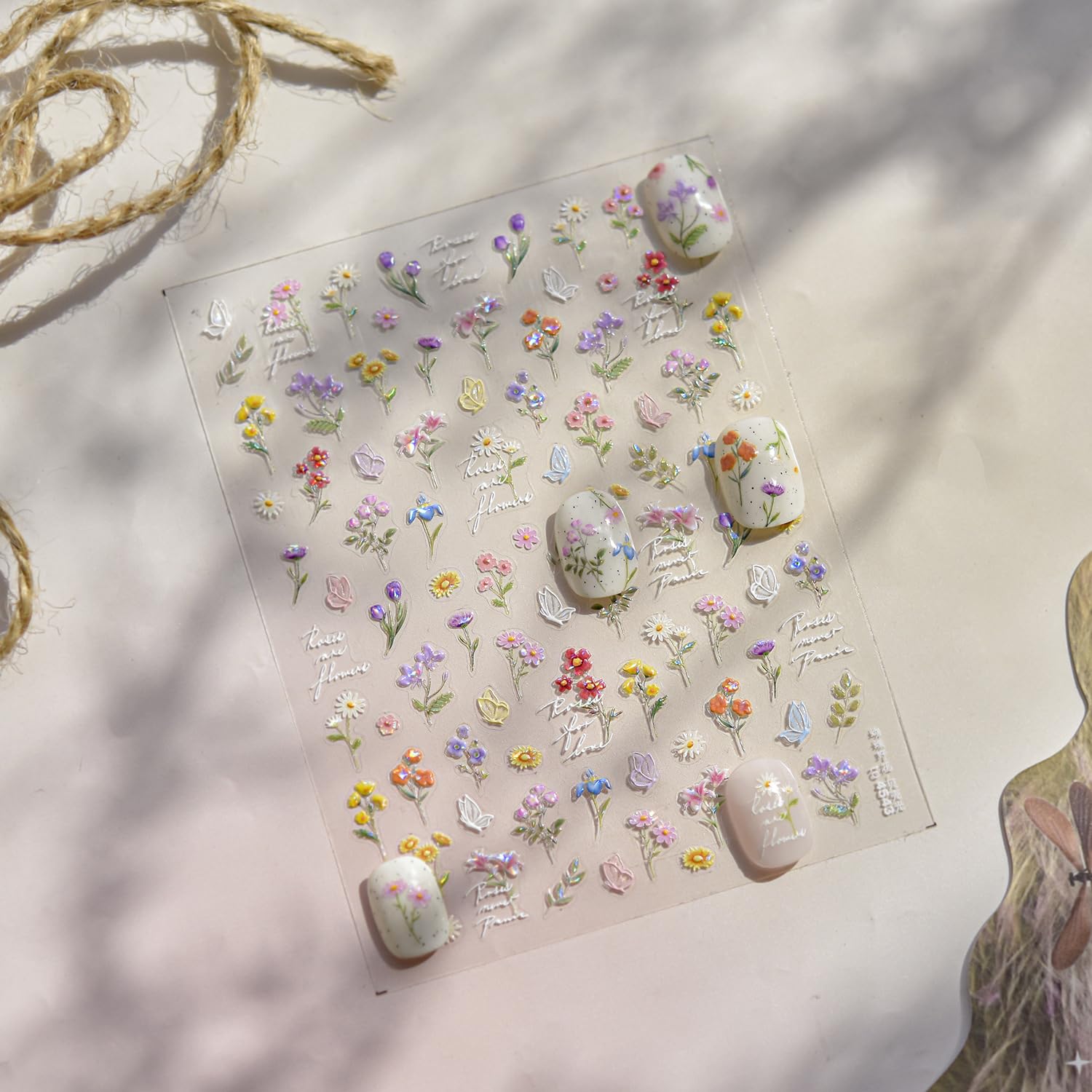Flowers Nail Art Stickers for Acrylic Nails Colorful Flower Nail Decals 5D Embossed Self Adhesive Daisy Nail Sticker with Butterfly Designs Nail Stickers Spring Cute Floral Nail Decal for Women
