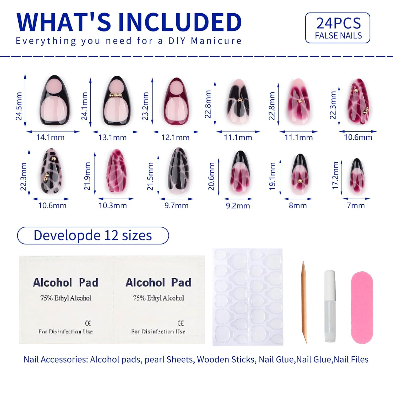 - Package Includes: 24 pcs stick on false glue on nails kit, each box includes 24 short press on nails, 1 sheet of 24 sticky nail pieces, 1 cuticle stick, 1 double sided nail file and gel press on nails cleaning pads, a small tube of nail glue,All the tools you need to apply the nails are included in one set