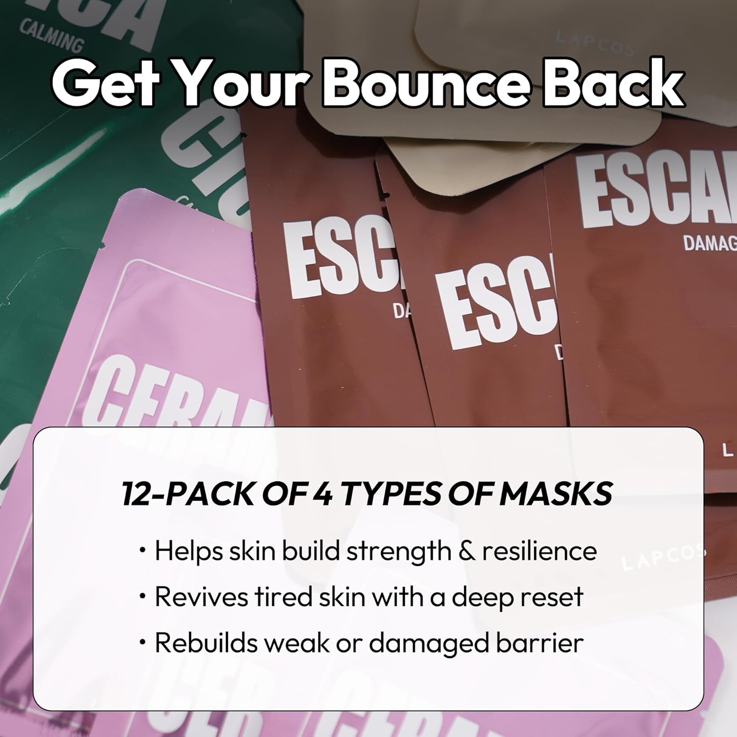 LAPCOS Skin Barrier Repair Sheet Mask Variety Pack – Escargot, Cica, Ceramide, Honey 4 Types of Face Mask Set – Daily Korean Skin Care w/Snail Mucin, Centella Asiatica & Niacinamide (12 ea)