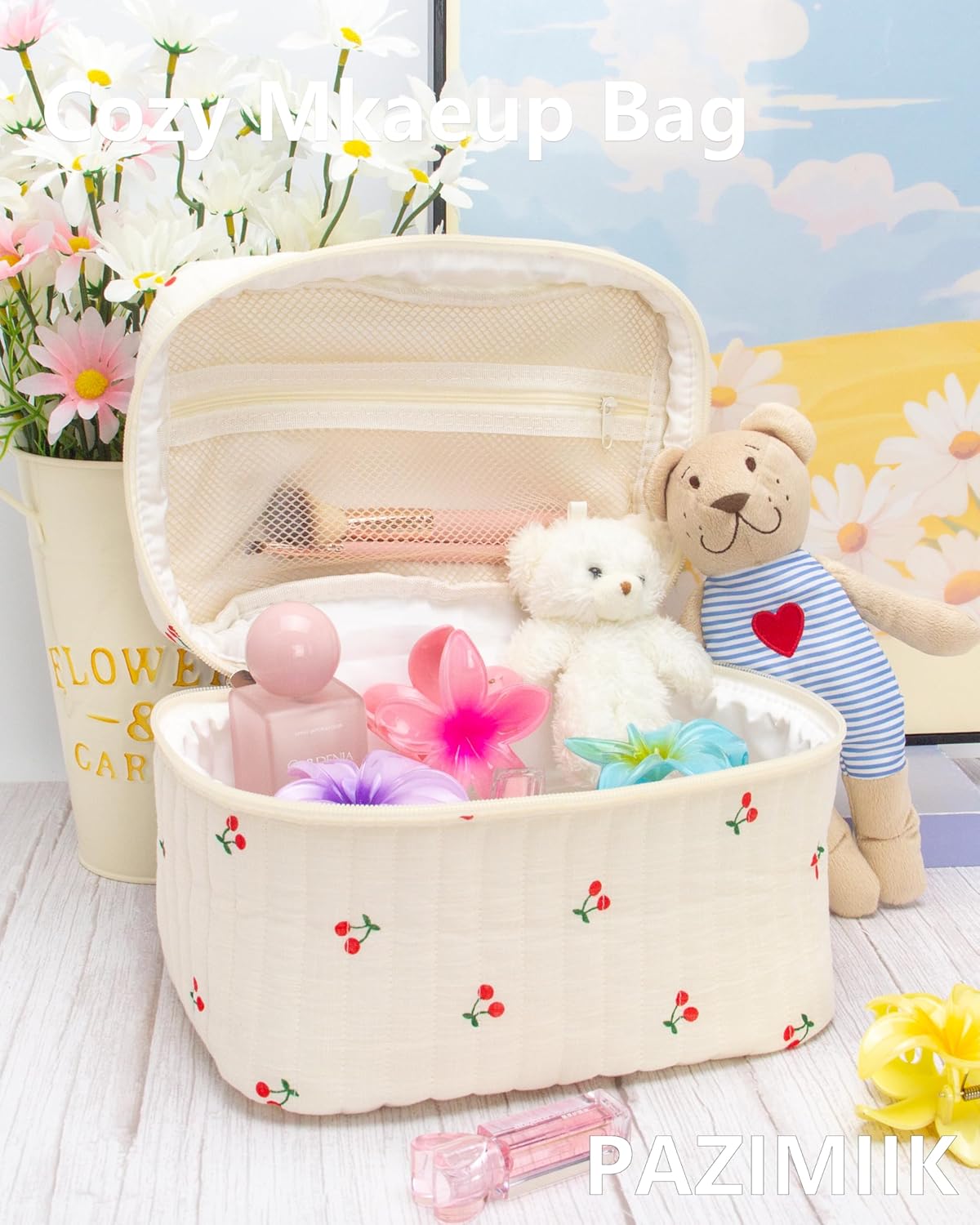 PAZIMIIK 3PCS Makeup Bag SET Large Travel Quilted Zipper Soft Cosmetic Case Pouch for Women Girls Make Up,Cherry Beige