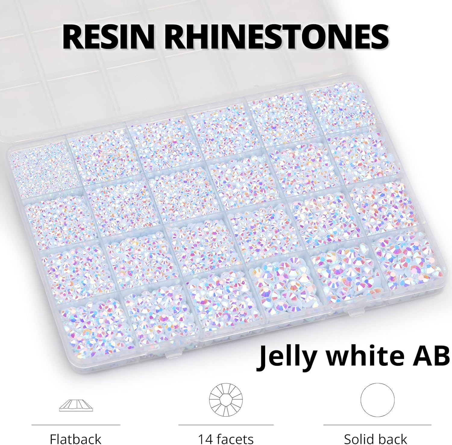 - Package Content with Tool (pickup pen and manual) -- The bedazzler kit Package includes 1 jelly white ab rinestones set with 24 grids, approx 30000 pcs of 2-6mm bling-out resin rhinestones