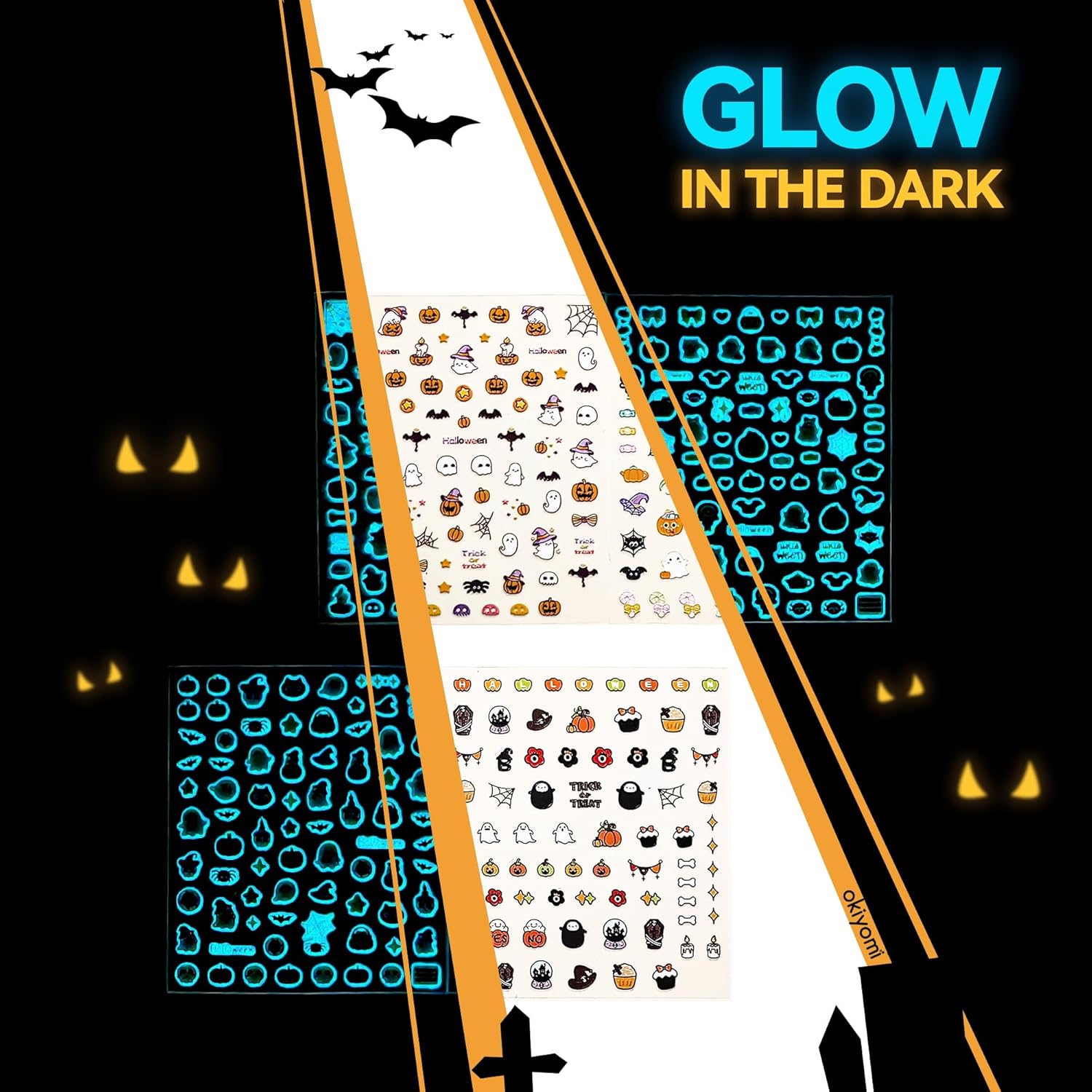 - GLOW-IN-THE-DARK: Shine a bright light on the nail decals for five minutes and marvel as they emit a gentle glow, casting a soft, spellbinding light that’s perfect for trick-or-treating or haunted fun.