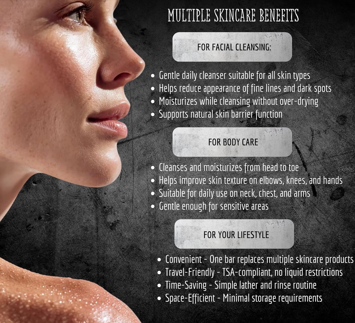 - FACE AND BODY CLEANSING SOAP - Suitable for cleansing face, neck, hands, and body. Helps reduce the appearance of dark spots, fine lines, and uneven skin texture while providing gentle daily cleansing for all skin types