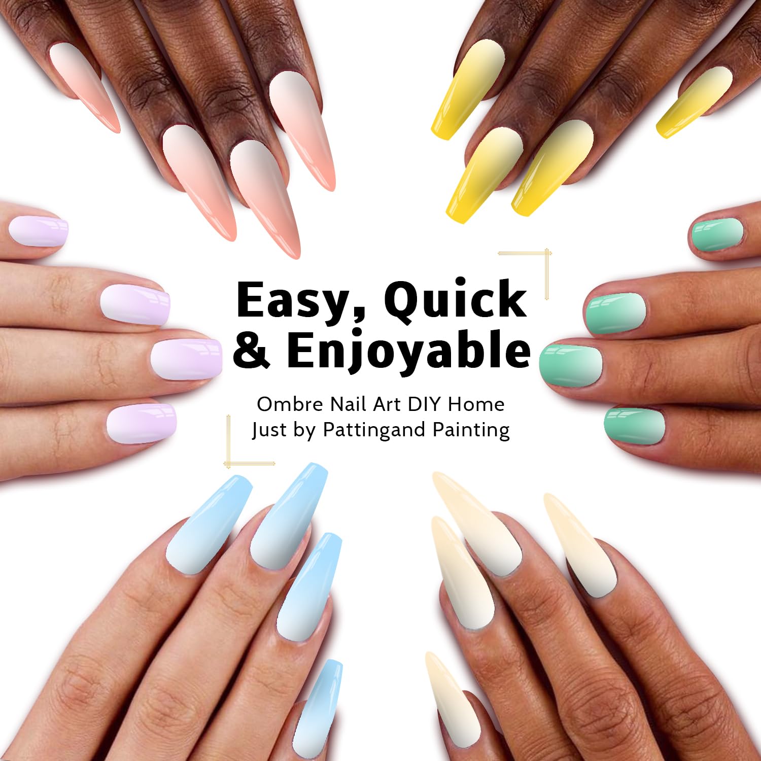 • 【EASY USE:】All steps are the same as normal UV/LED nail gel: 1.Clean and Prep; 2. Base coat and cure. 3. Apply color gel and cure. 4. Top coat and cure. 5. Clean nails and apply oil. Karroy ombre painting nail gel is easy to use: just grabbing a sponge and picking up your desire color, and patting sponge on your nail, you will get wonderful gradient coloring nails!
