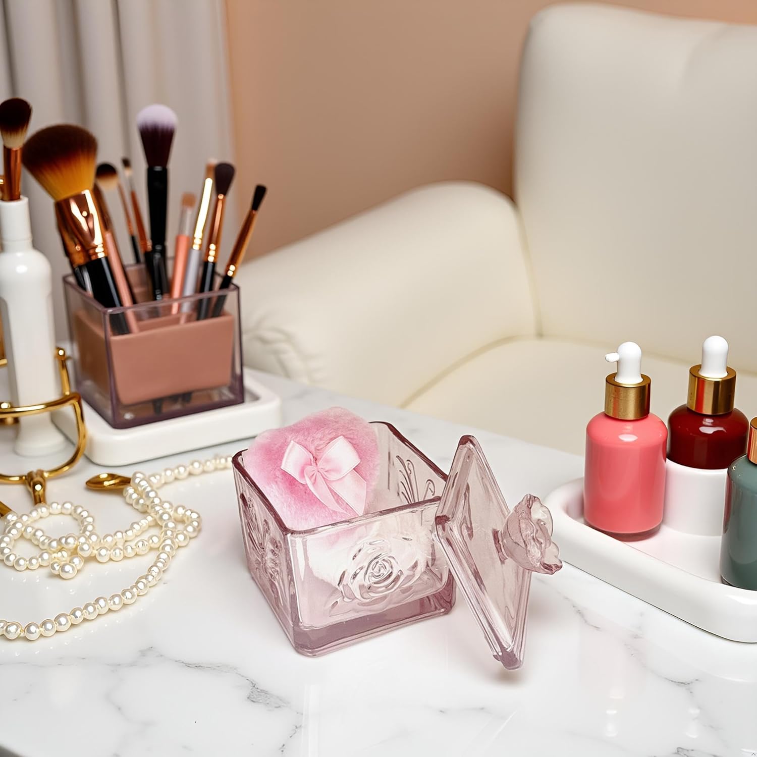- 【Durable & Easy to Clean】 This glass powder puff case is made of high quality glass material, beautiful and durable. This product is not a sealed jar, easy to clean and daily care, will not take up too much space, but can store your daily trinkets and keep your items organized.