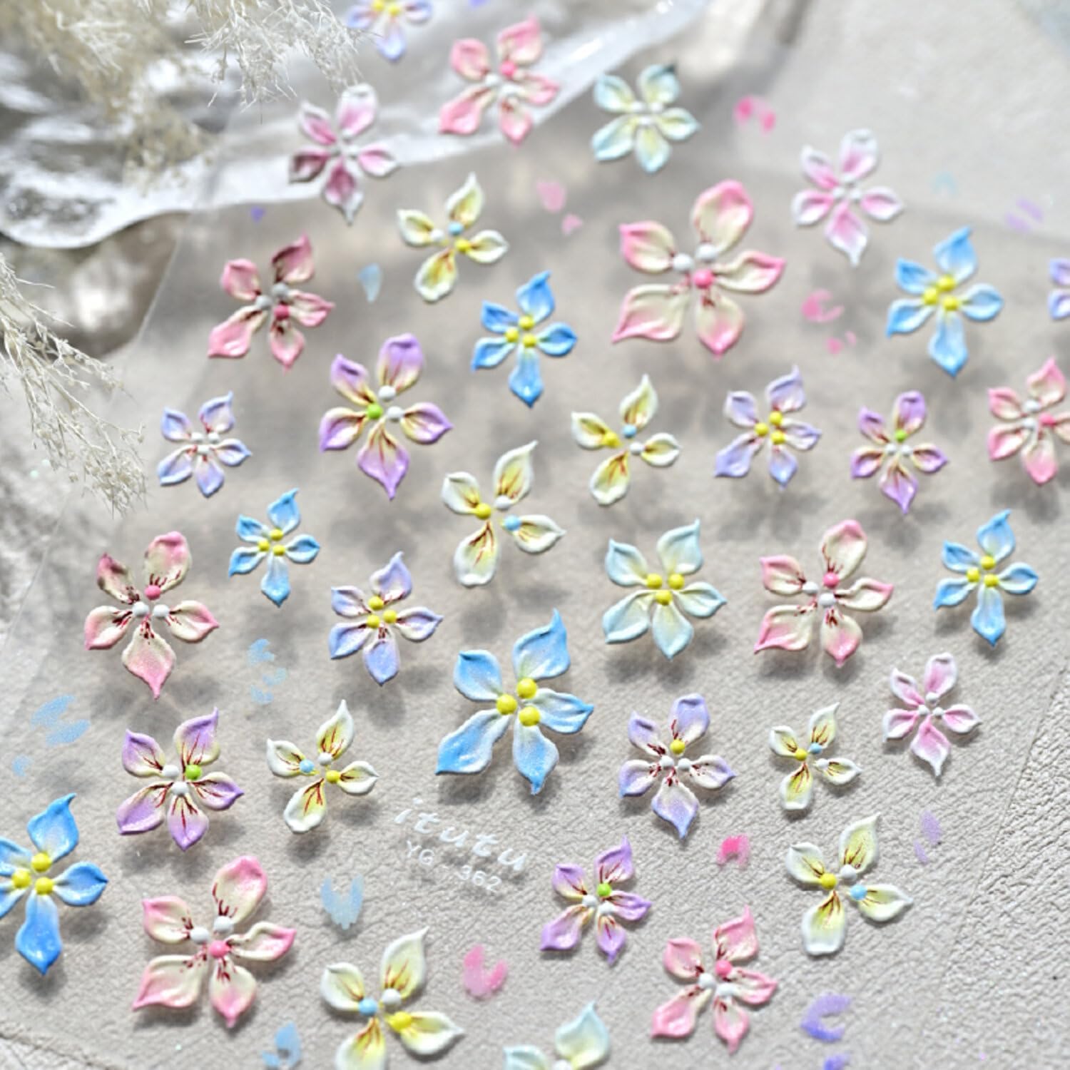- Flower Nail Decals: 1 sheet of 5D embossing carving patterns litter fresh petal flower plant nail stickers give people an intuitive and advanced exquisite feeling. Floral five-petal flower elements summer design nail decals are perfect for decorations for your spring summer nails.