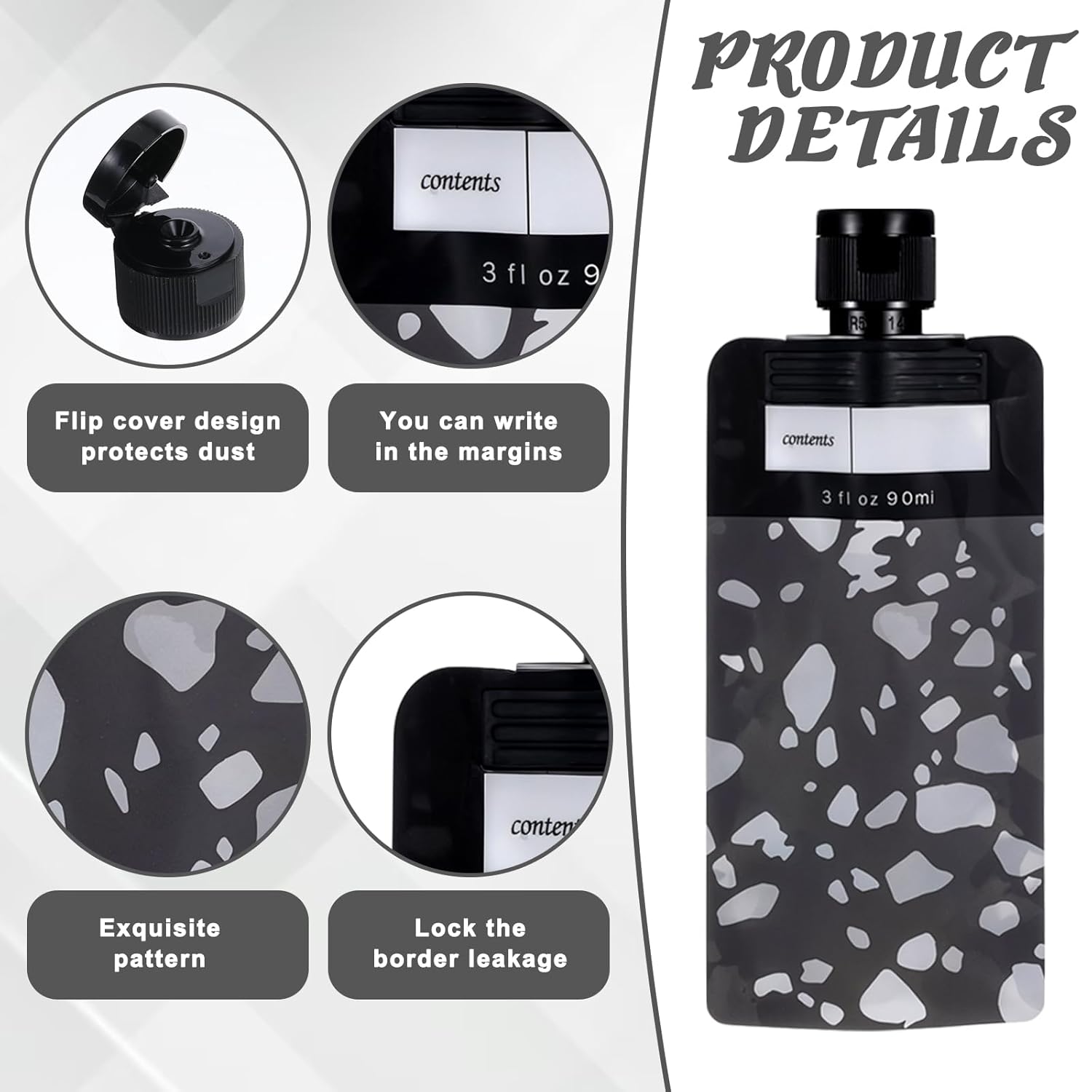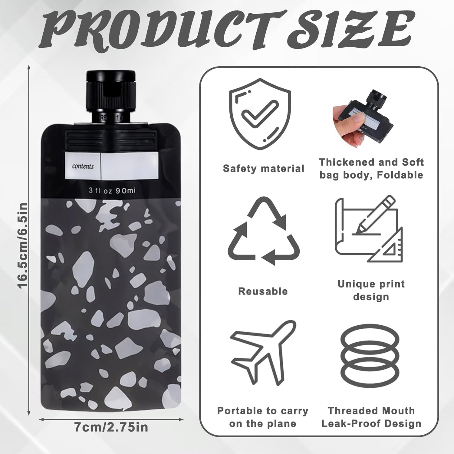- Safe Material: Each travel liquid container is made of high-quality PET+PA+PE, which is safe, sturdy and durable, and is not easy to deform or break after long-term use