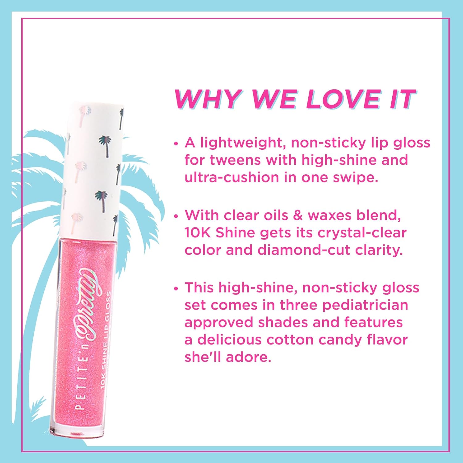 • 3 Shimmering Shades - Includes Snow Cute (iridescent shimmer), Gold Frost Girl (frosty pink shimmer), and All That Glitters (golden shimmer). Each mini gloss delivers icy sparkle that’s perfect for any occasion.
