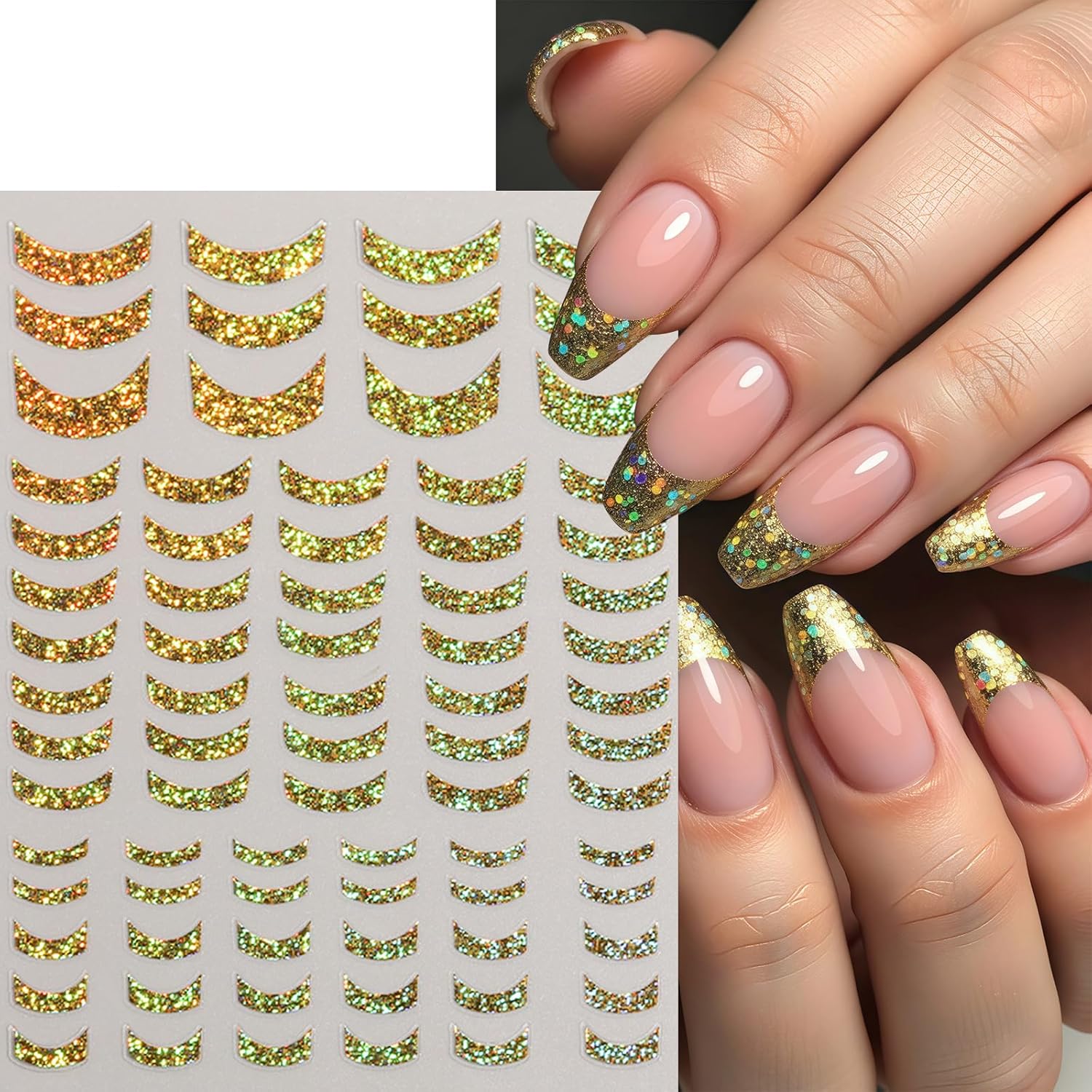 8 Sheets French Tip Nail Art Stickers 3D Self-Adhesive Gold Laser Stripes French Line Transfer Decals Curved Lines Nail Art Designs Glitter Guides Stripe Manicure Accessories for Women DIY Nail Decor