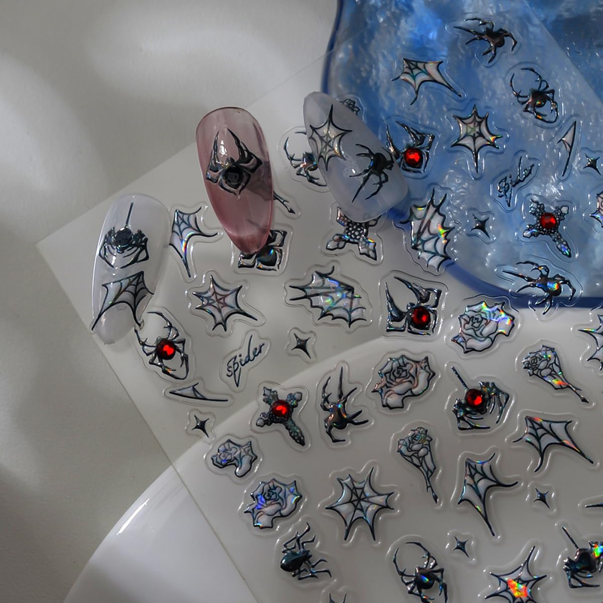 Spider Web Nail Stickers Flower Nail Decals with Rhinestone Design 5D Self Adhesive Nails Art Stickers Charms Supply for Women Girls Kid Halloween Manicure DIY Decoration Accessories