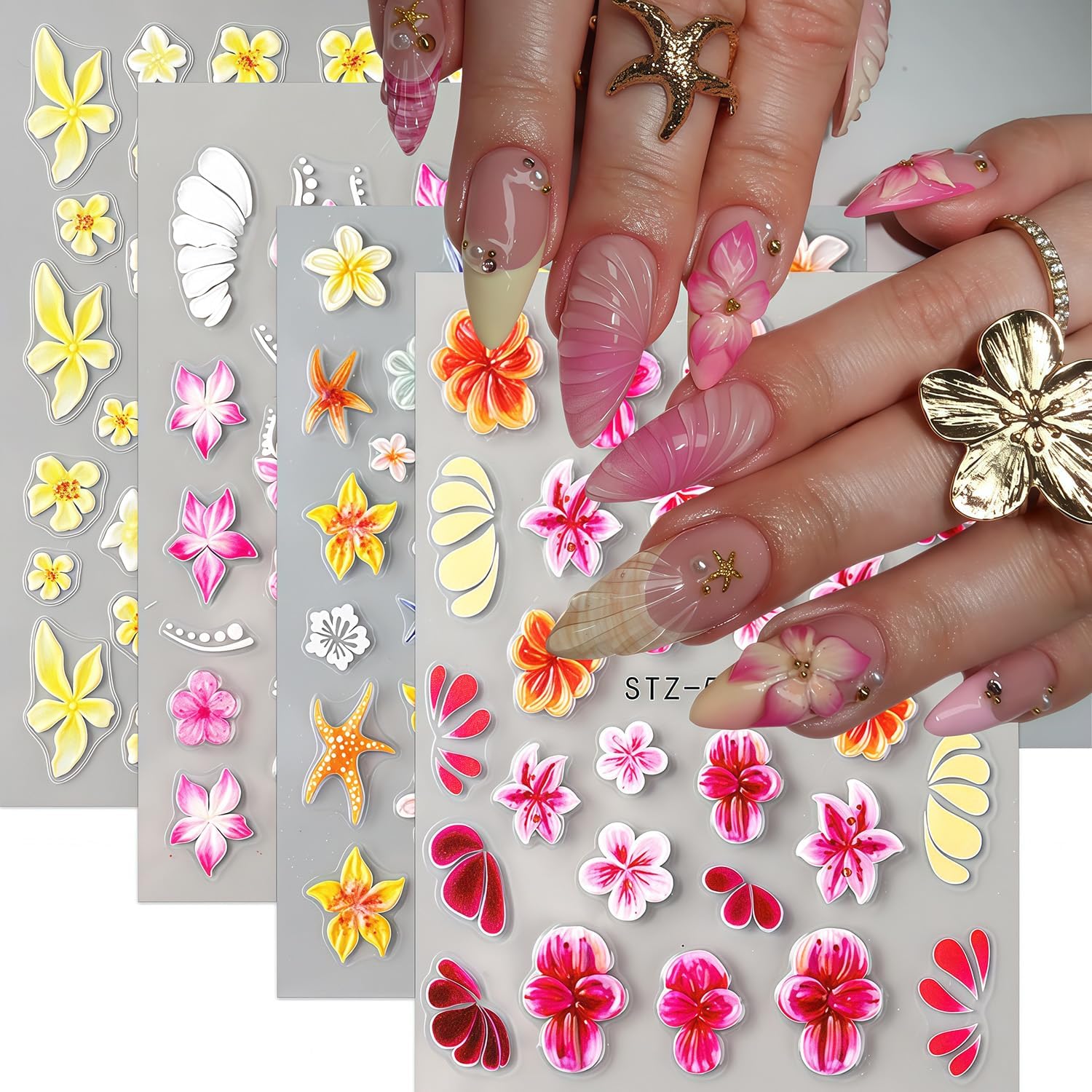 Summer Nail Stickers 5D Embossed Cute Flower Pattern Ocean Colorful Starfish Self-Adhesive Design Nail Art Stickers Beach Nail Decals for Women Festival Vacation Manicure Kit DIY Decoration