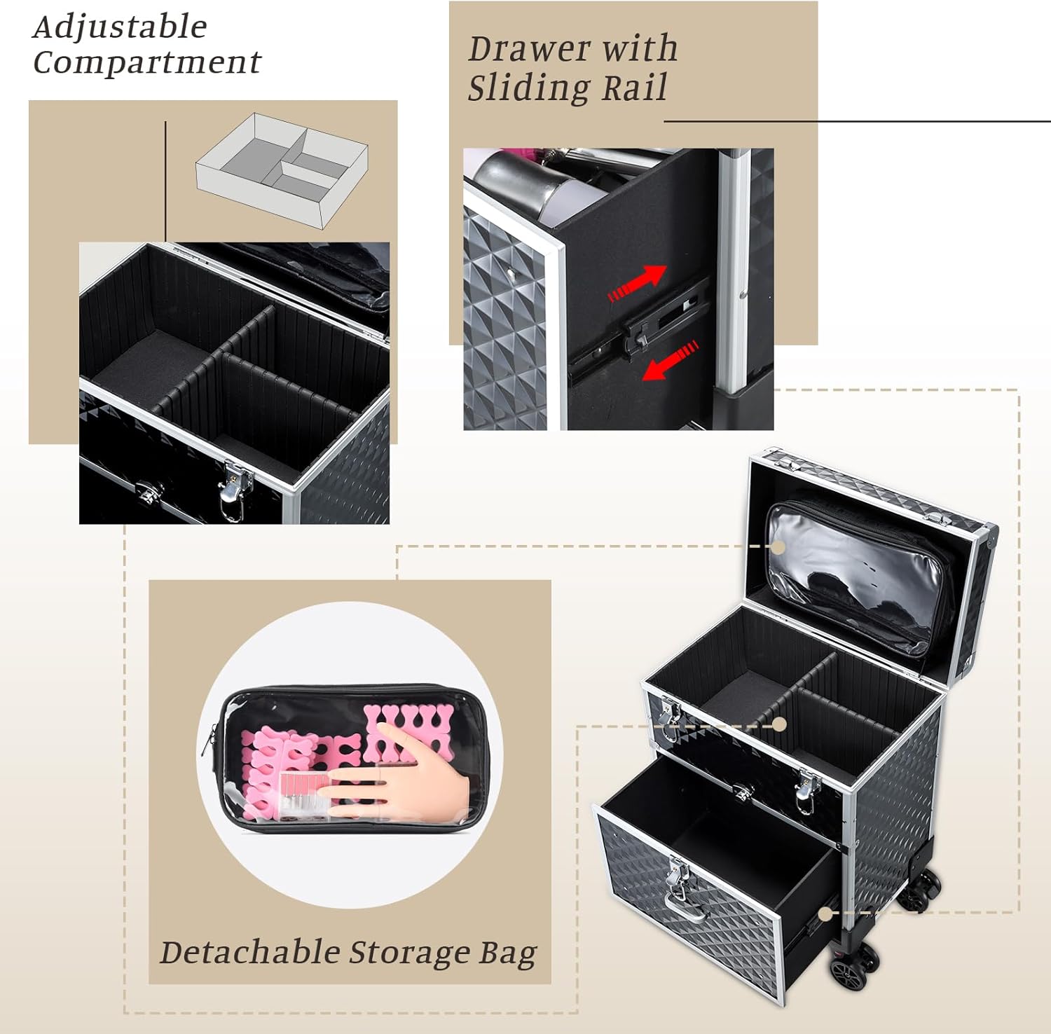 - Multi-Functional Rolling Case - The wheeled rolling makeup case with drawer is designed to meet the needs of professionals such as nail technicians, makeup artists, and hairstylist. It is also coated with pretty diamond stlye finish.