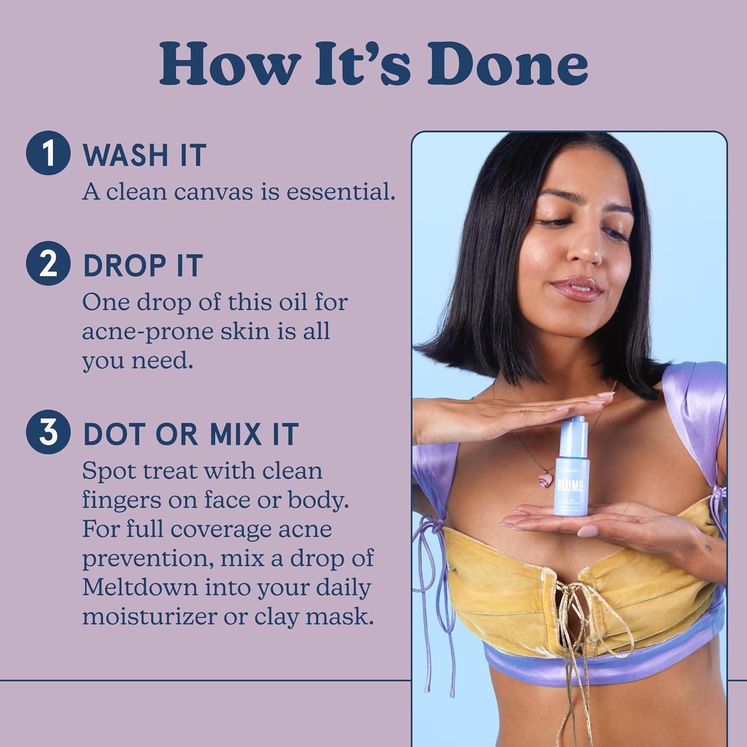 - A Revelation In Skincare - Meltdown is an award-winning facial oil designed for acne-prone skin, made from a powerful blend of clean ingredients to clear skin, without compromising hydration. This natural acne treatment helps to calm redness, minimize pores and prevent future breakouts. Always hydrating and never drying.