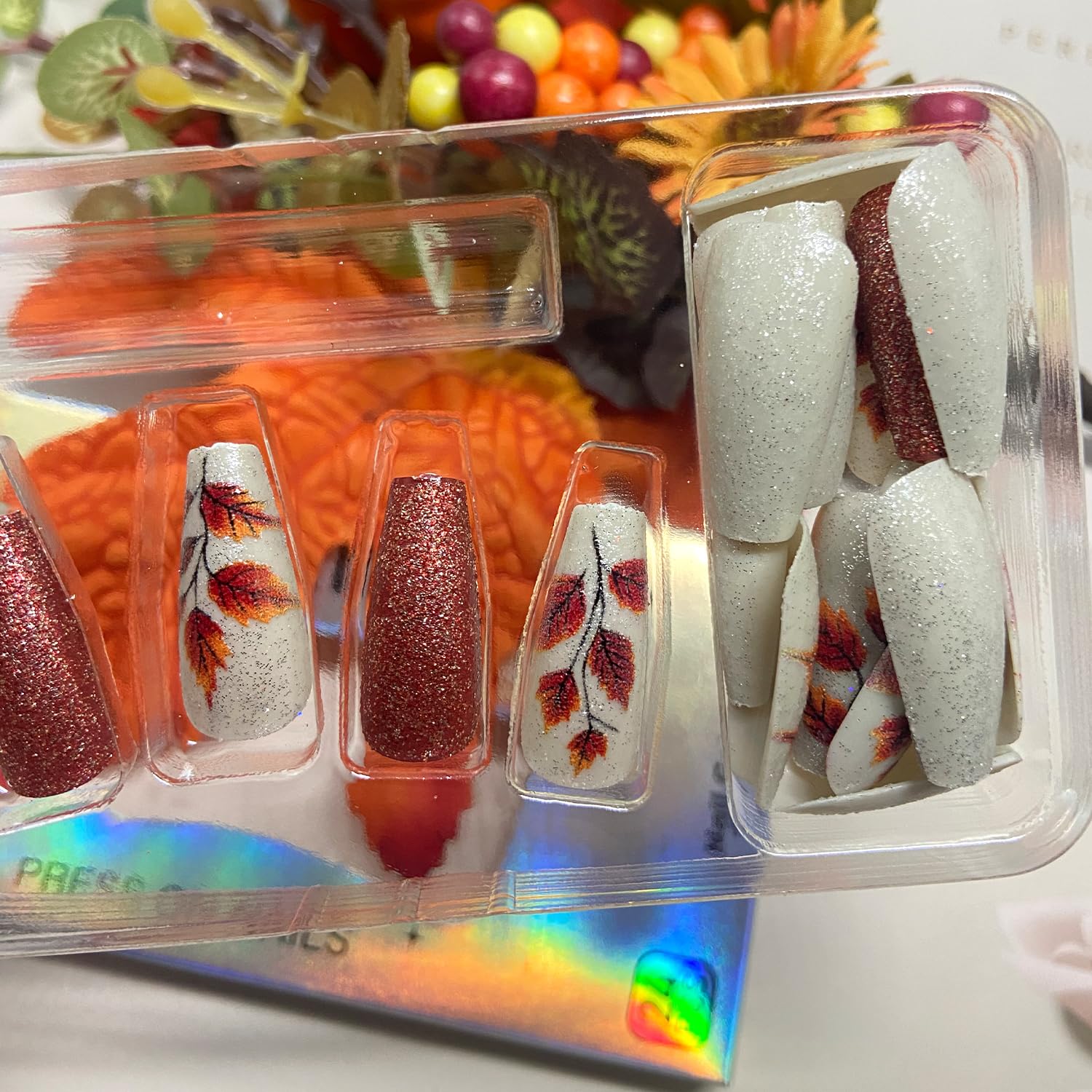 - Easy to Use: Instead of spend lots time and money at nail salon, you can change you nails style in 15 minutes anytime and anywhere. The maple leaves fake nails will stay longer if you clean your nails before use, and avoid water within the first hour of wearing