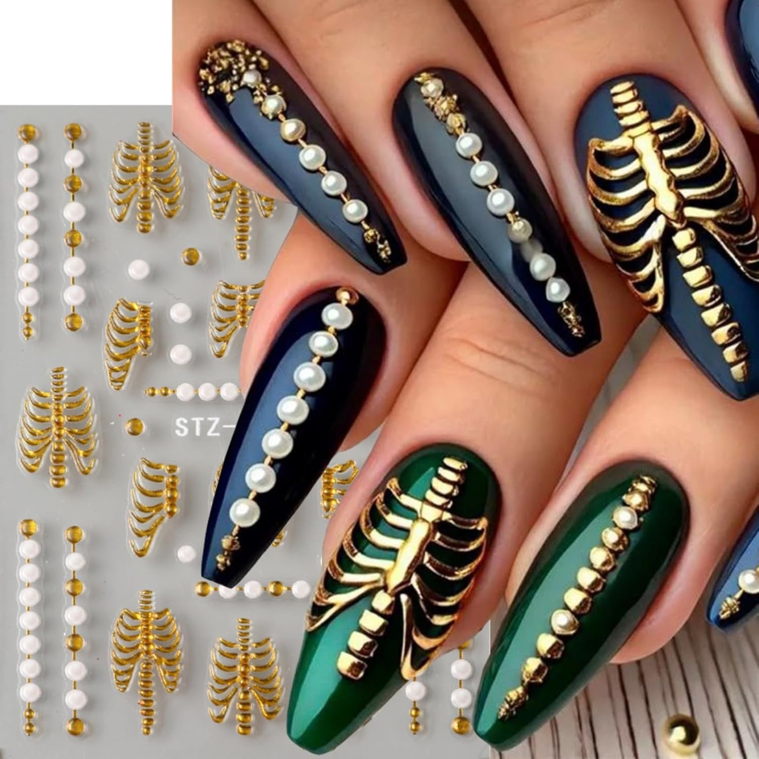 2Pcs Halloween Nail Art Stickers 5D Embossed Halloween Nail Decals Gold Pink Skeleton Bone Rose Blossom Pattern Nail Designs Stickers Skull Nail Supplies for Women Manicure Tip Decorations Accessories