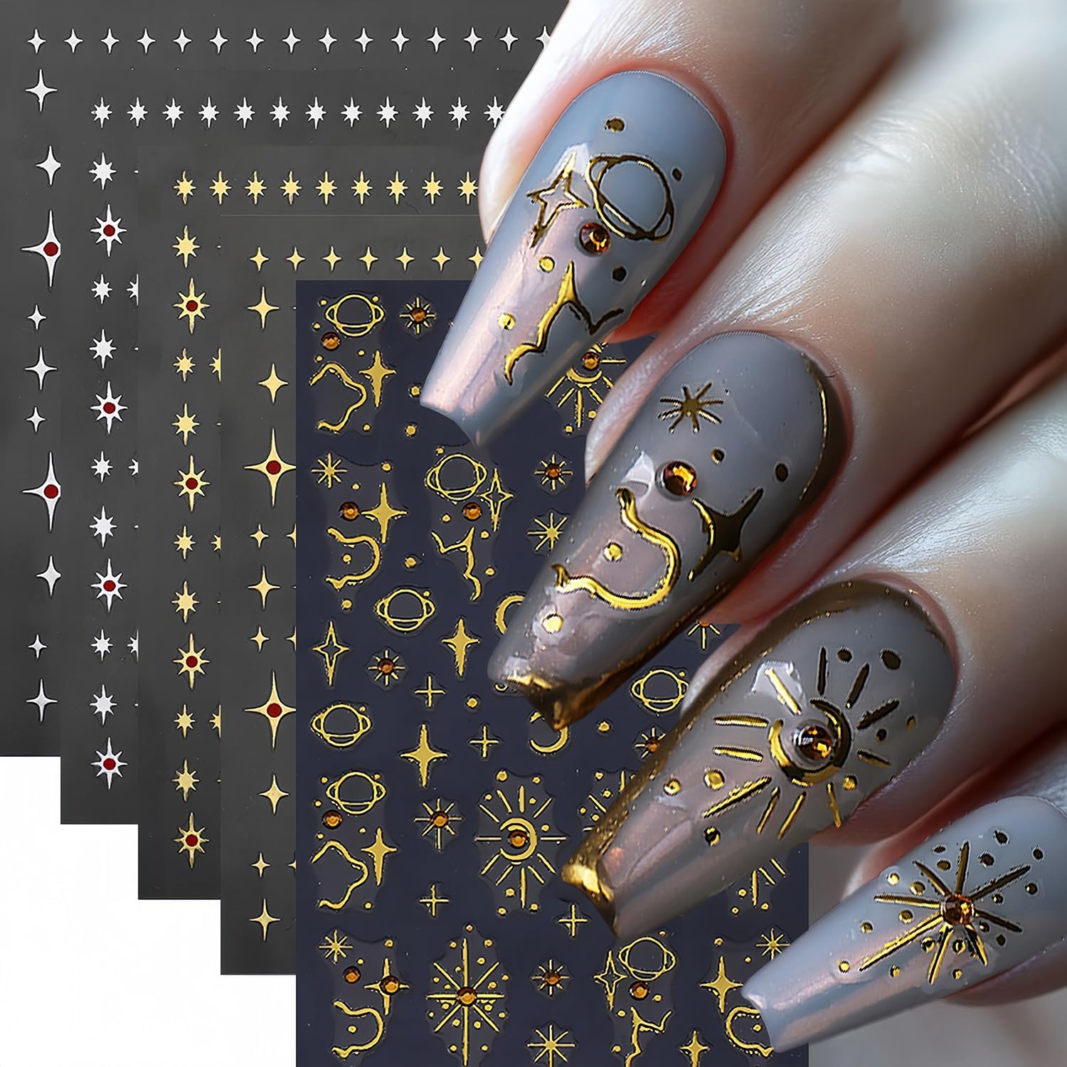 - Quantity: You will get 5 sheets of stars nail art stickers, including gold star and moon designs, not easy to fall off or fade, can easily create a variety of themed nail art, meet various nail art needs
