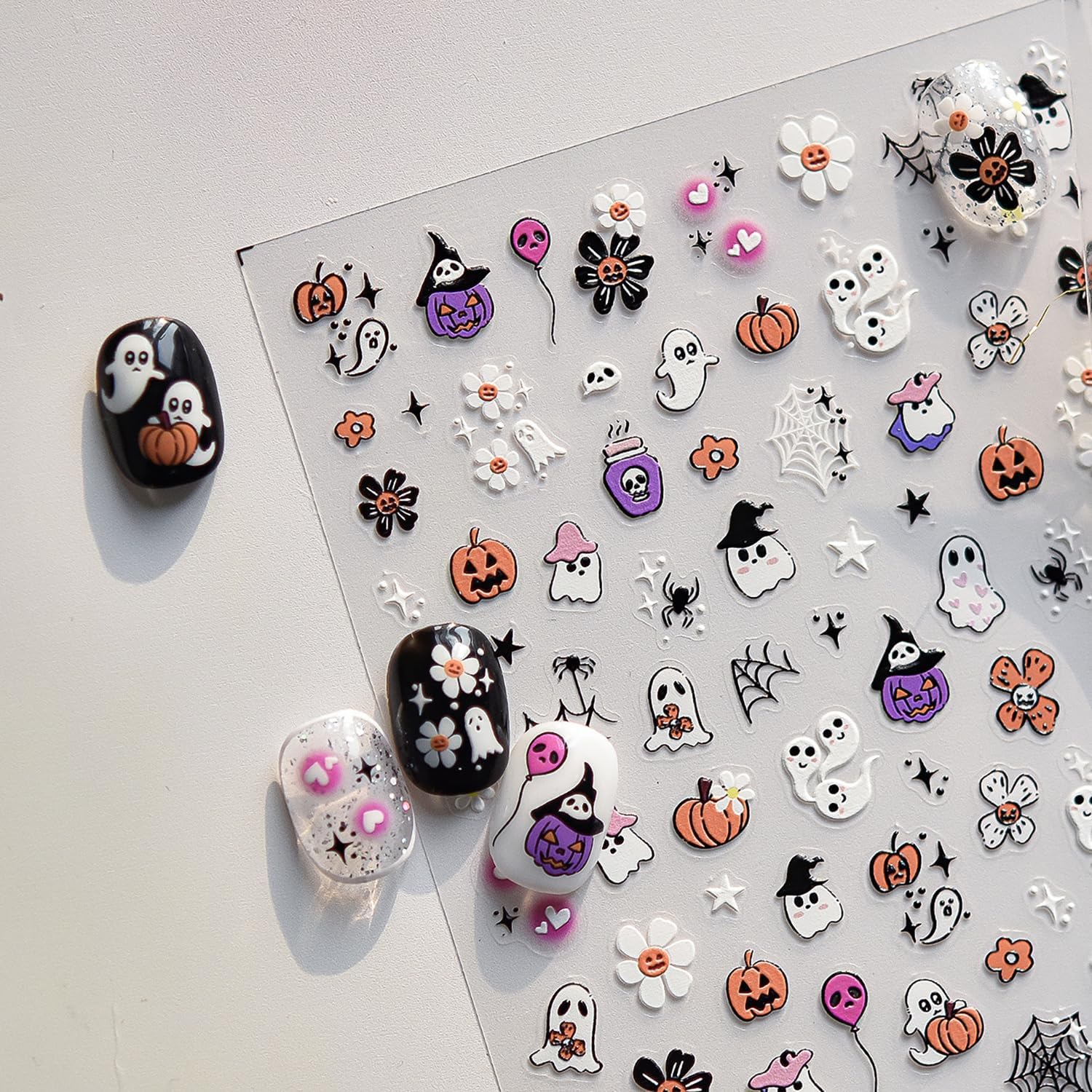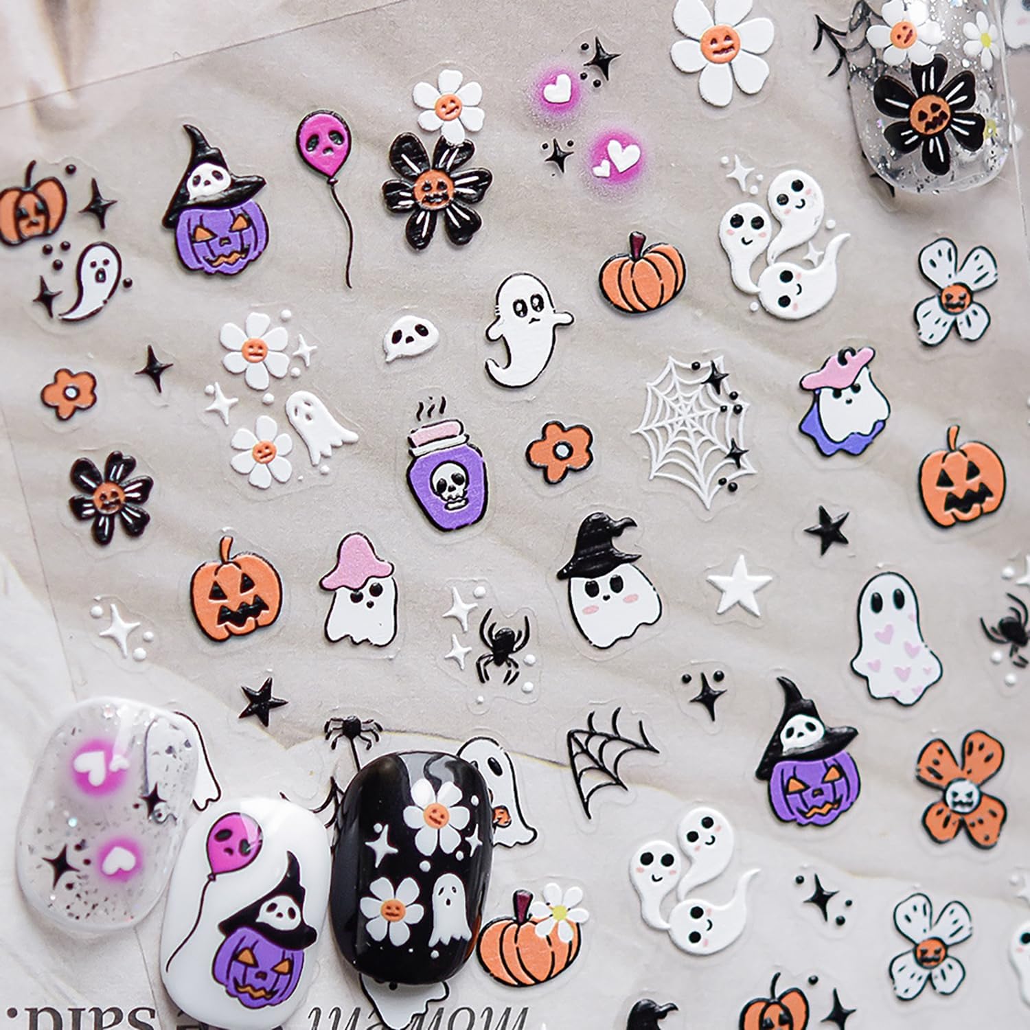 Halloween Ghost Nail Stickers 5D Embossed Halloween Nail Decals for Nail Art Designs Self Adhesive Cute Pumpkin Spider Nail Art Stickers Flower Nails Supplies for Women Nail Manicure