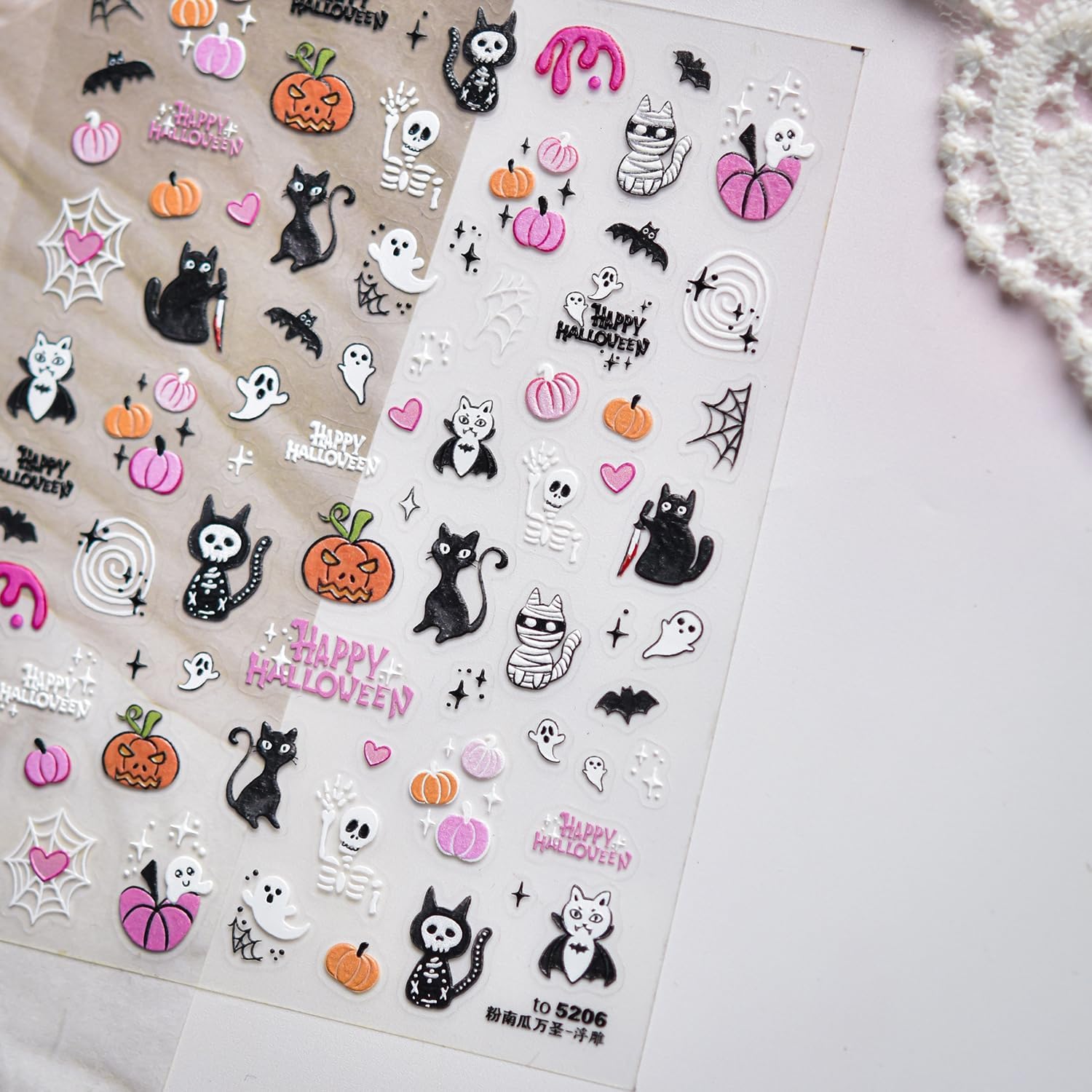 5D Embossed Halloween Nail Stickers Cute Cat Ghost Nail Art Stickers for Nail Designs Self Adhesive Halloween Pumpkin Mummy Nail Decals for Women Nails Supplies Decoration Accessores